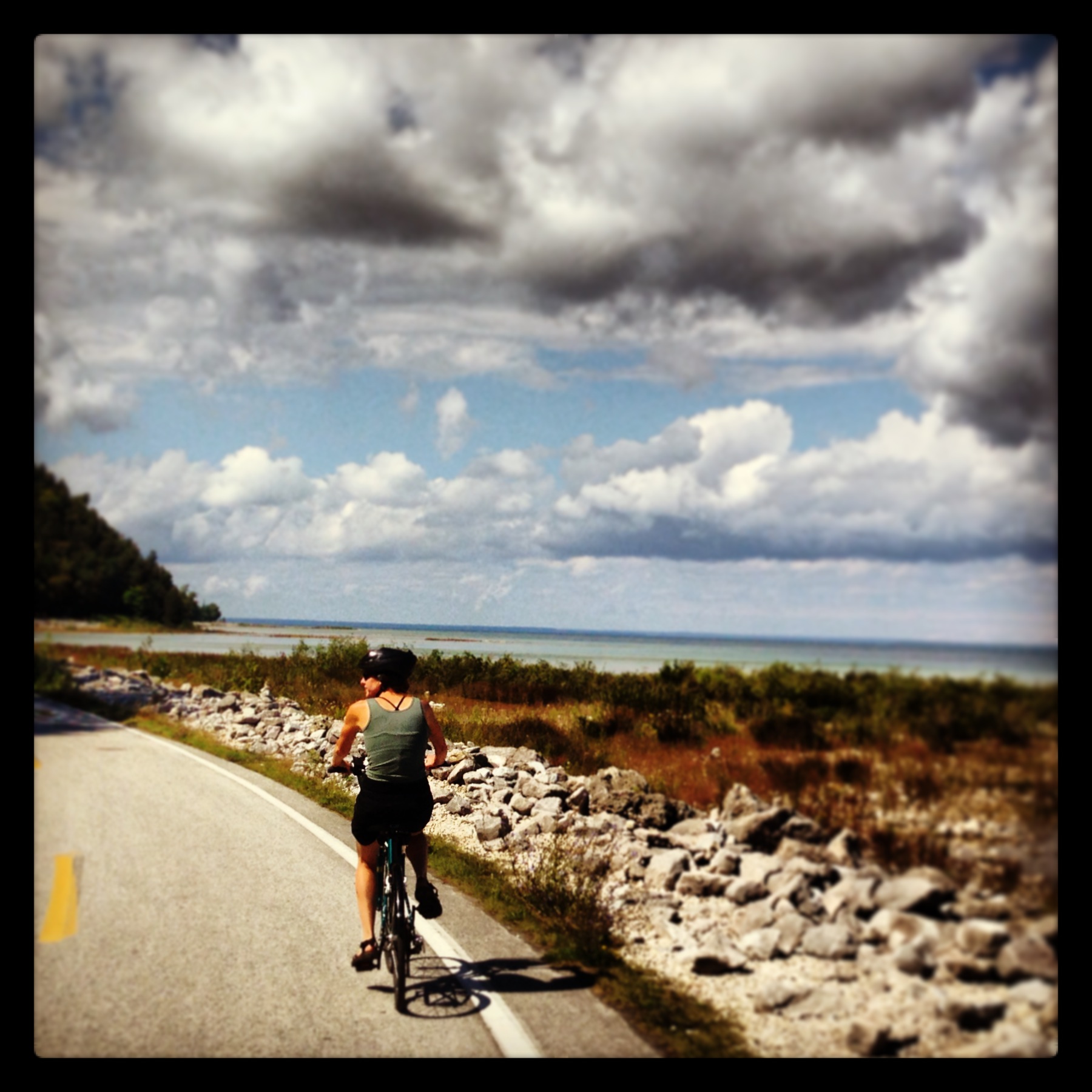 On our lap around the island, the storm clouds grew more and more menacing. We had a couple emergency fudge breaks, and finally had to stop and hide in some trees during a crazy downpour.