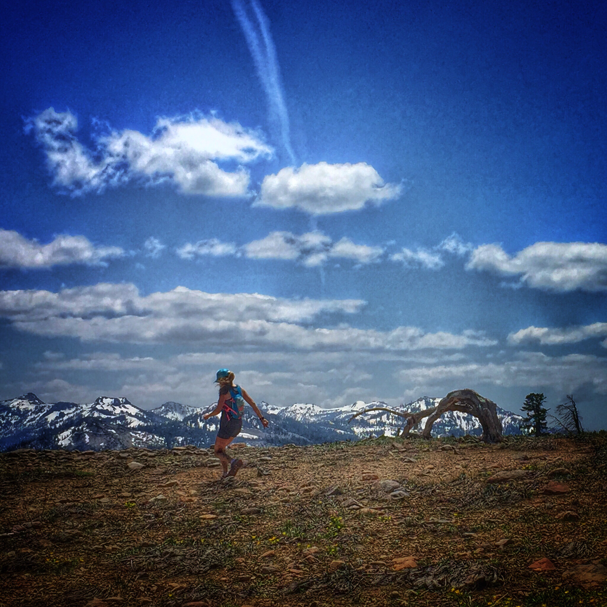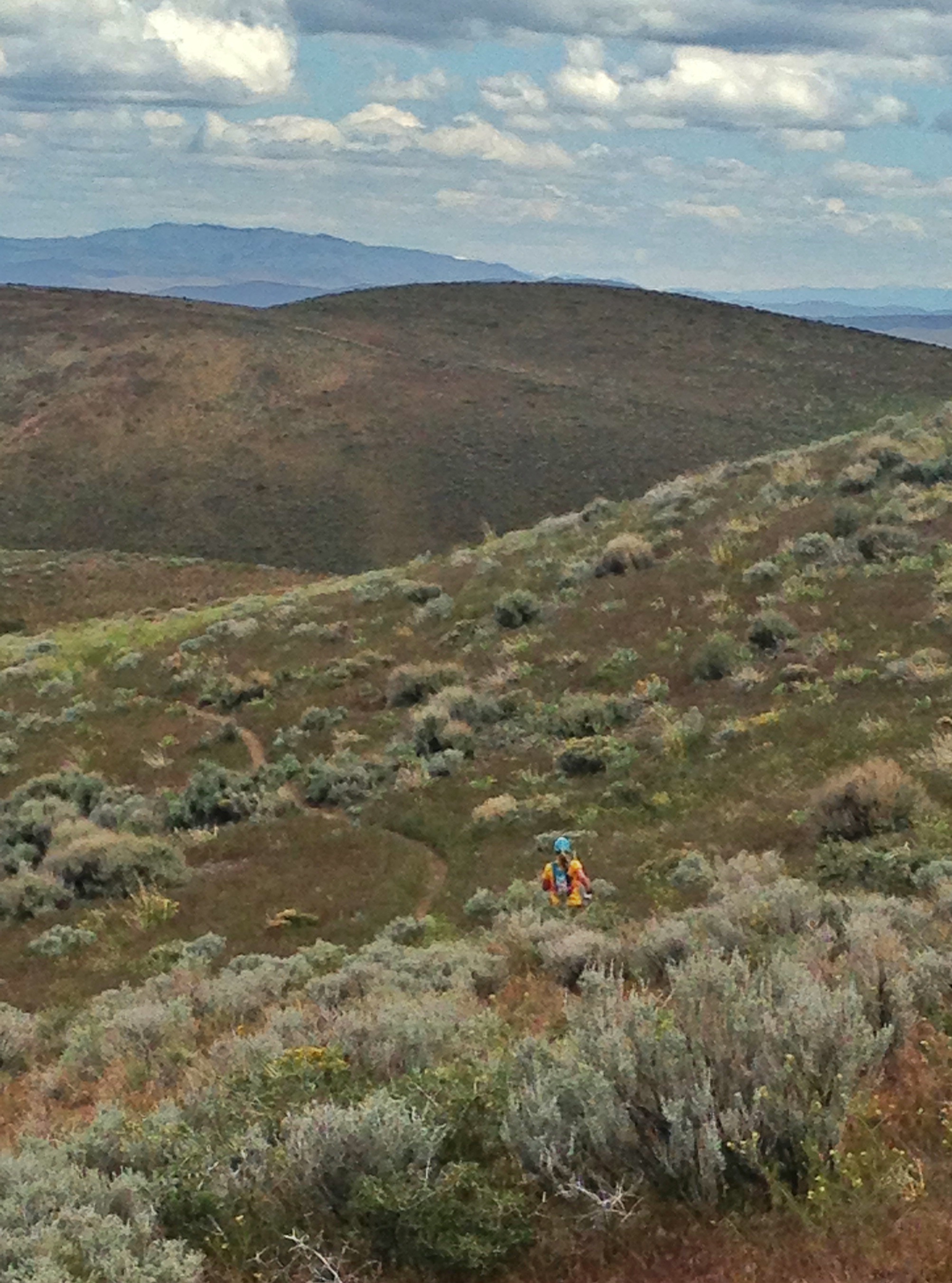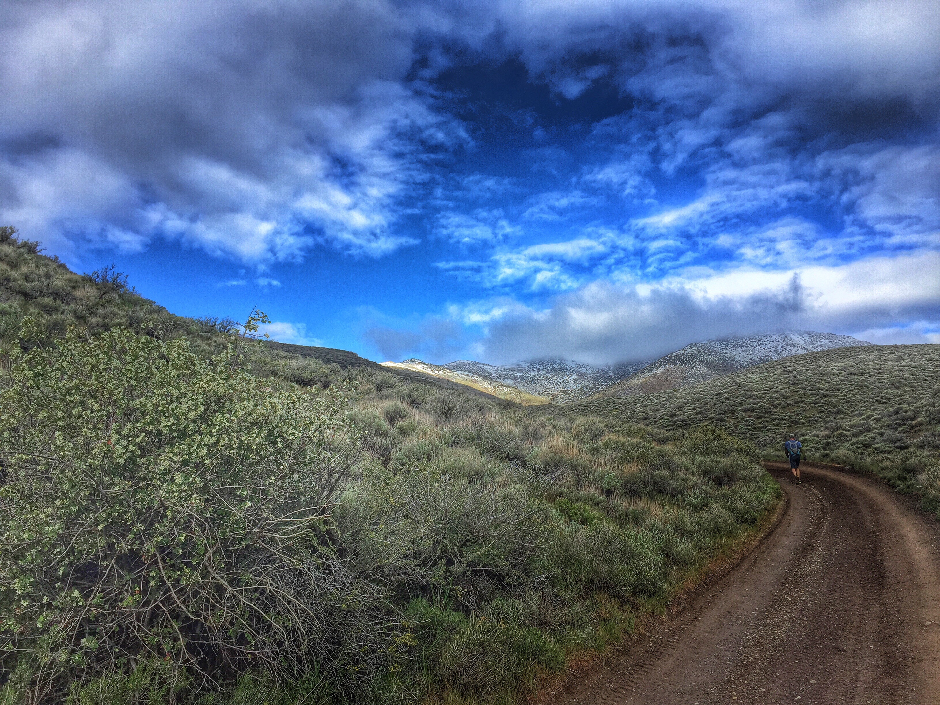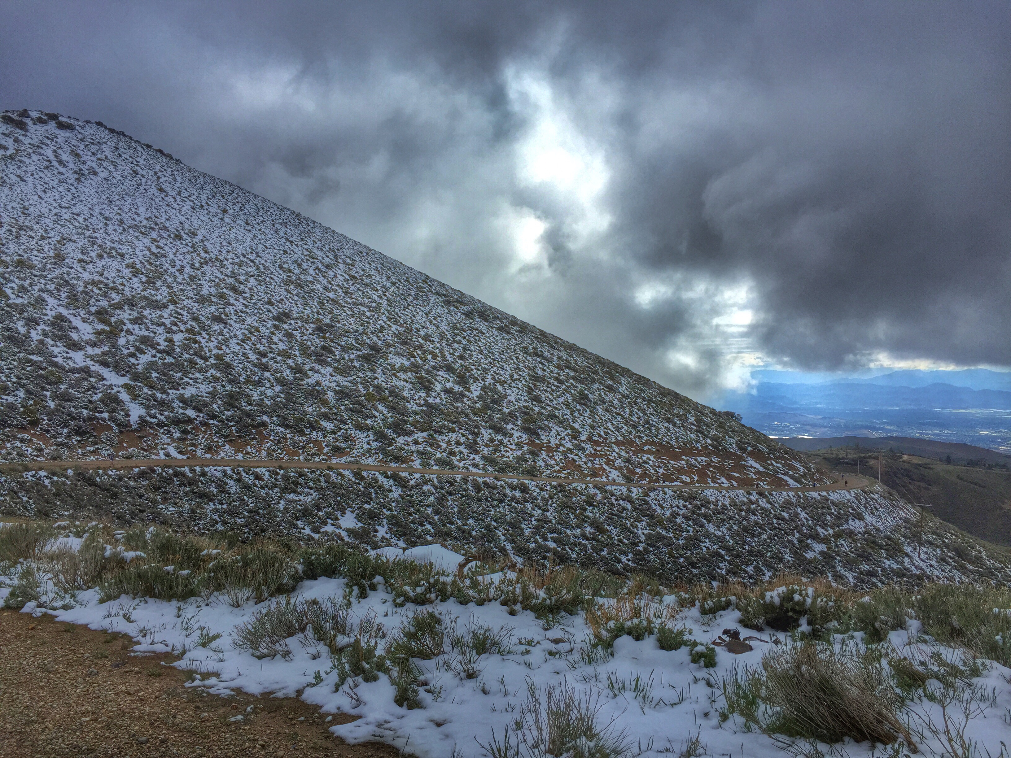 The views were breathtaking and surreal, with dramatic clouds, the ground covered in sections of green and flowers (oh, and mud), and every once in awhile Peavine Mountain, magical, covered in snow, rising sharply above us, would appear through a break in the clouds.
