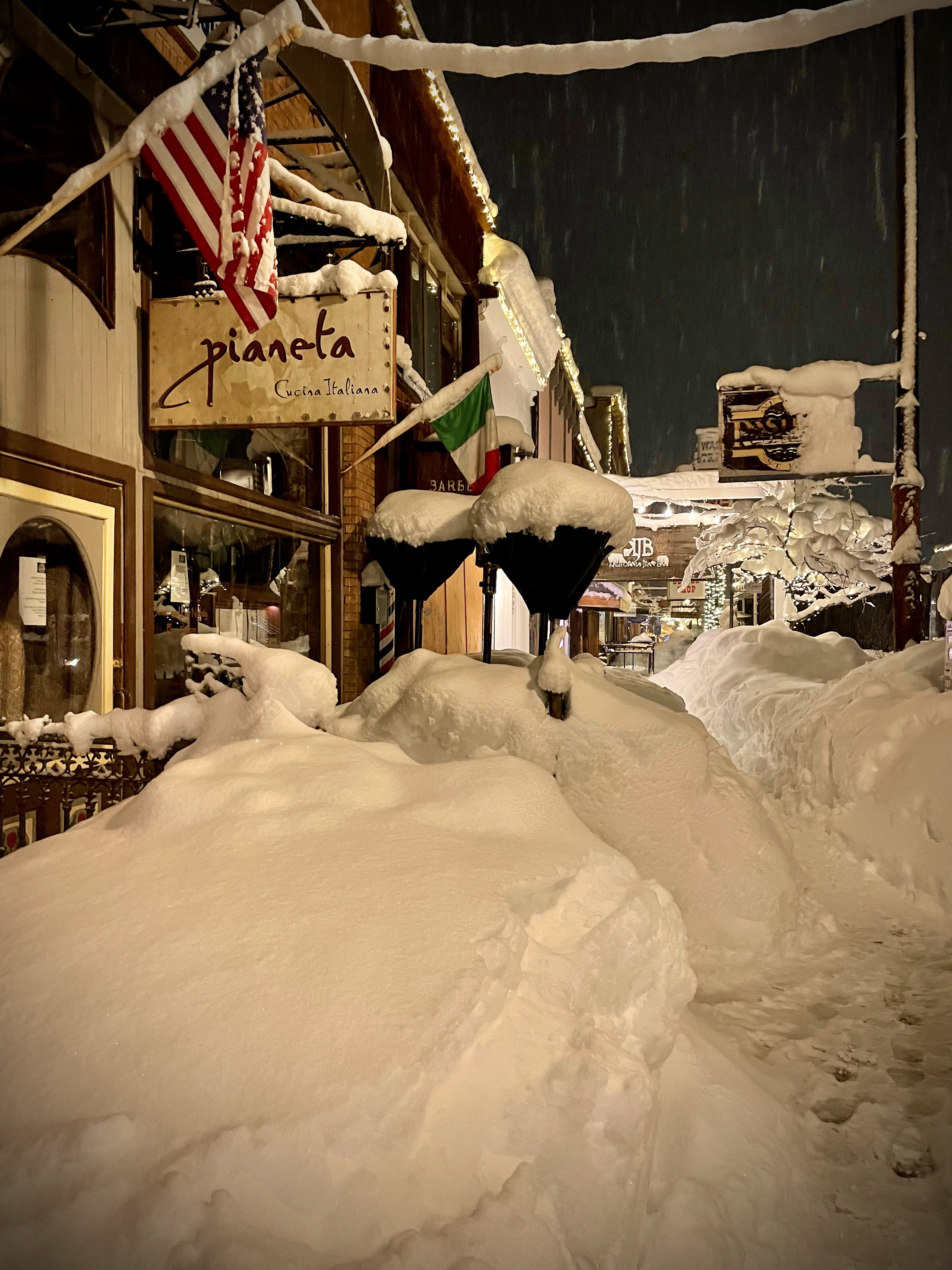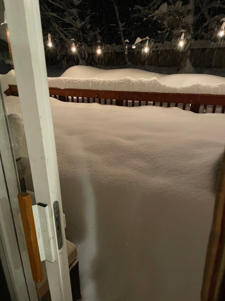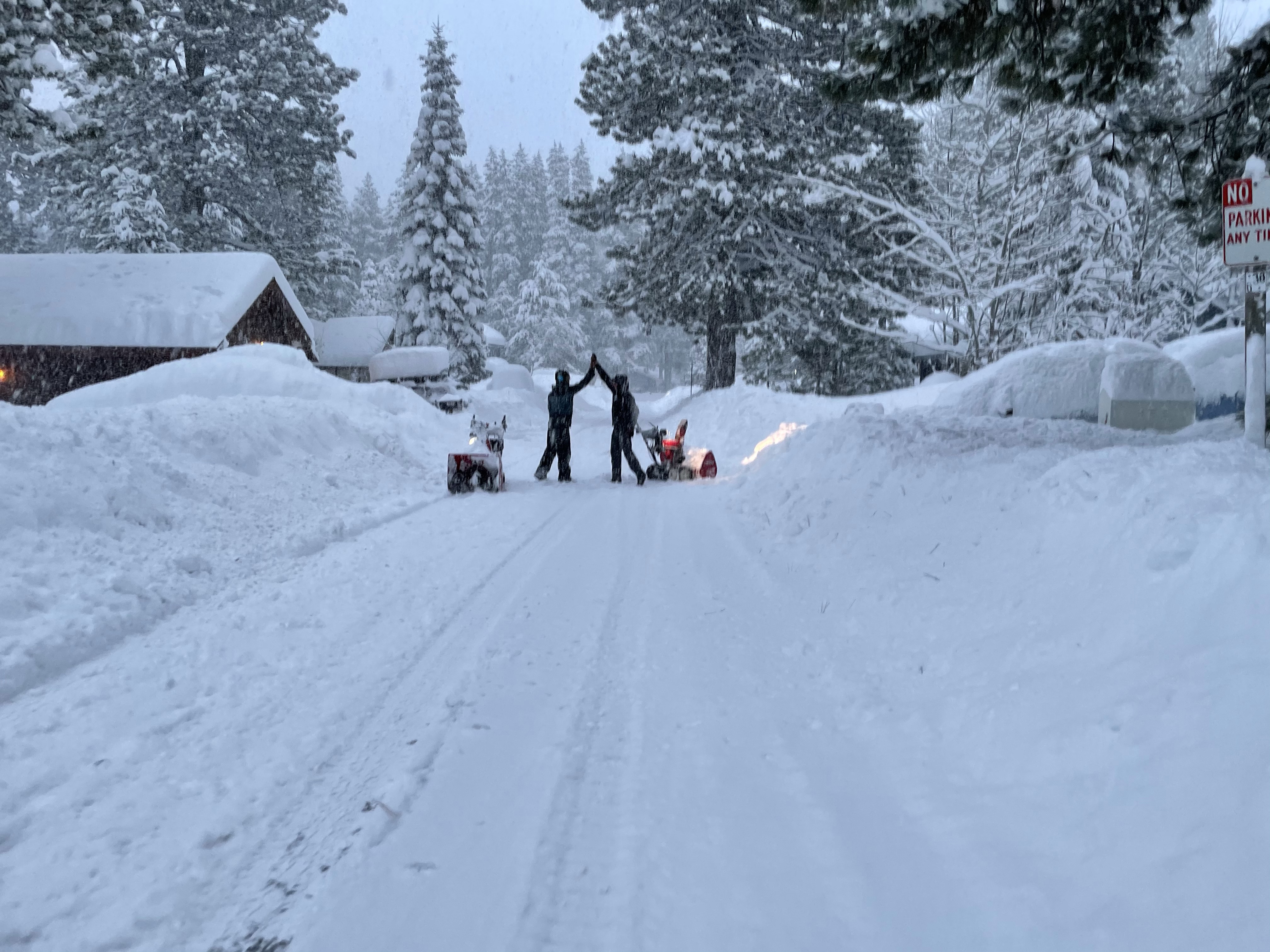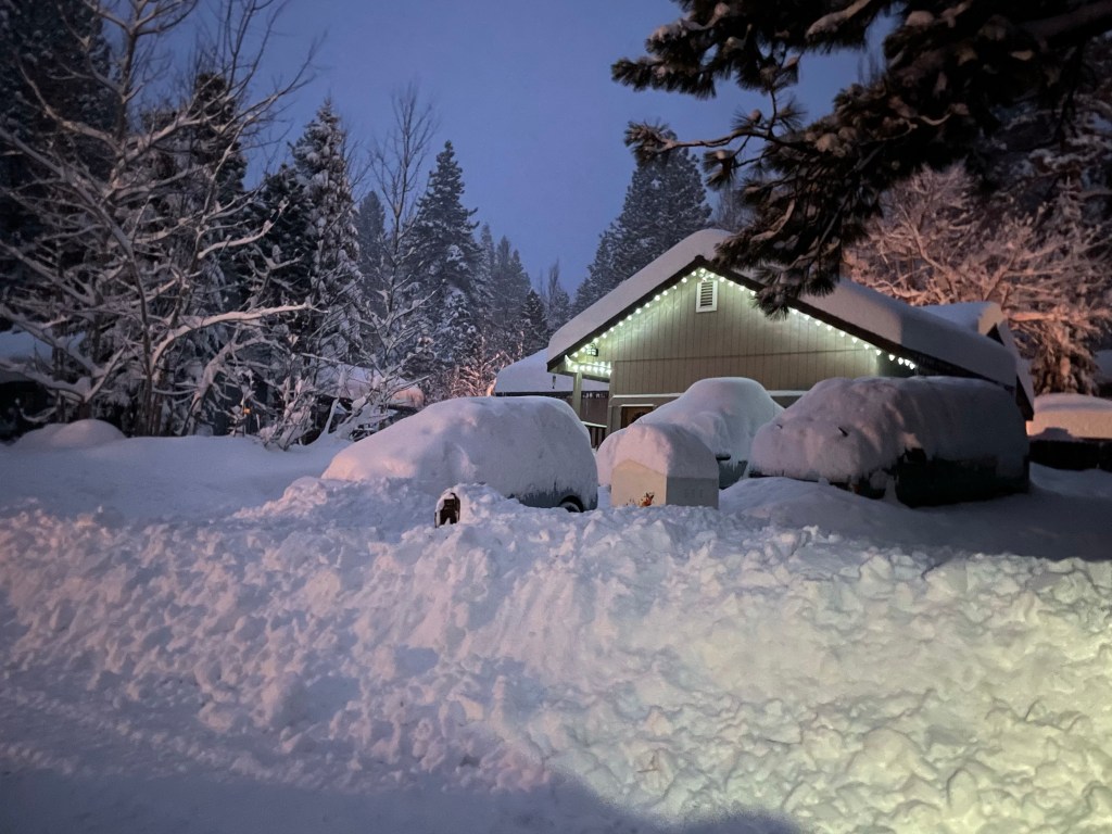 Our pretty little mountain town in the Sierra Nevada got buried last week, Tuesday-Thursday, as a classic atmospheric river rolled across the state. The first 24 hours, the storm was underwhelming. We were disappointed to only get about a foot of snow that first night. Weak. It snowed lightly during the day, off and on, accumulating about 6″, but nothing serious. Wednesday evening, we shoveled the decks again, just in case the storm wasn’t over.