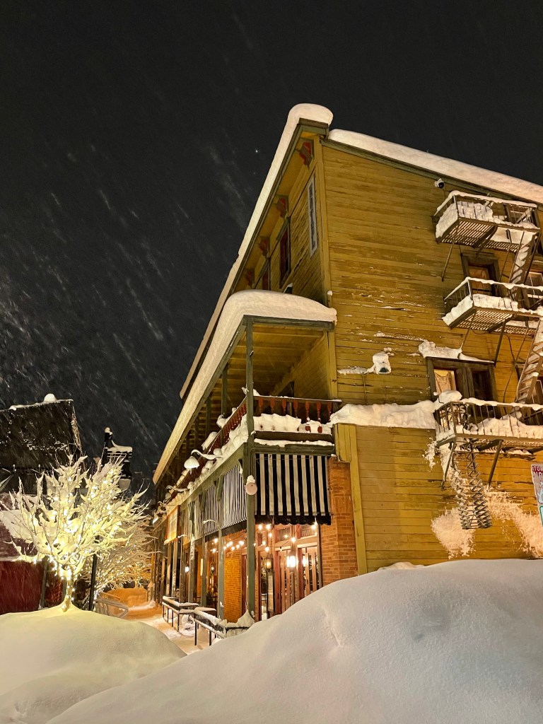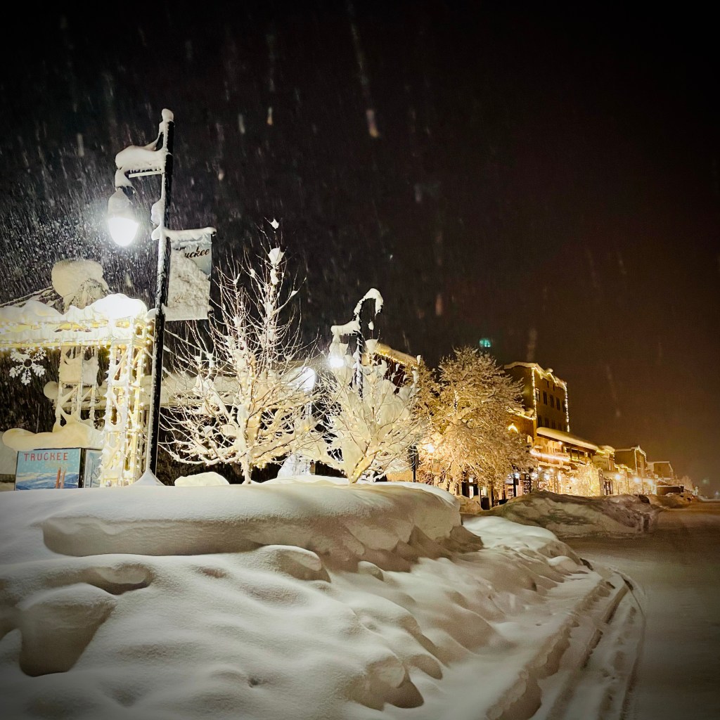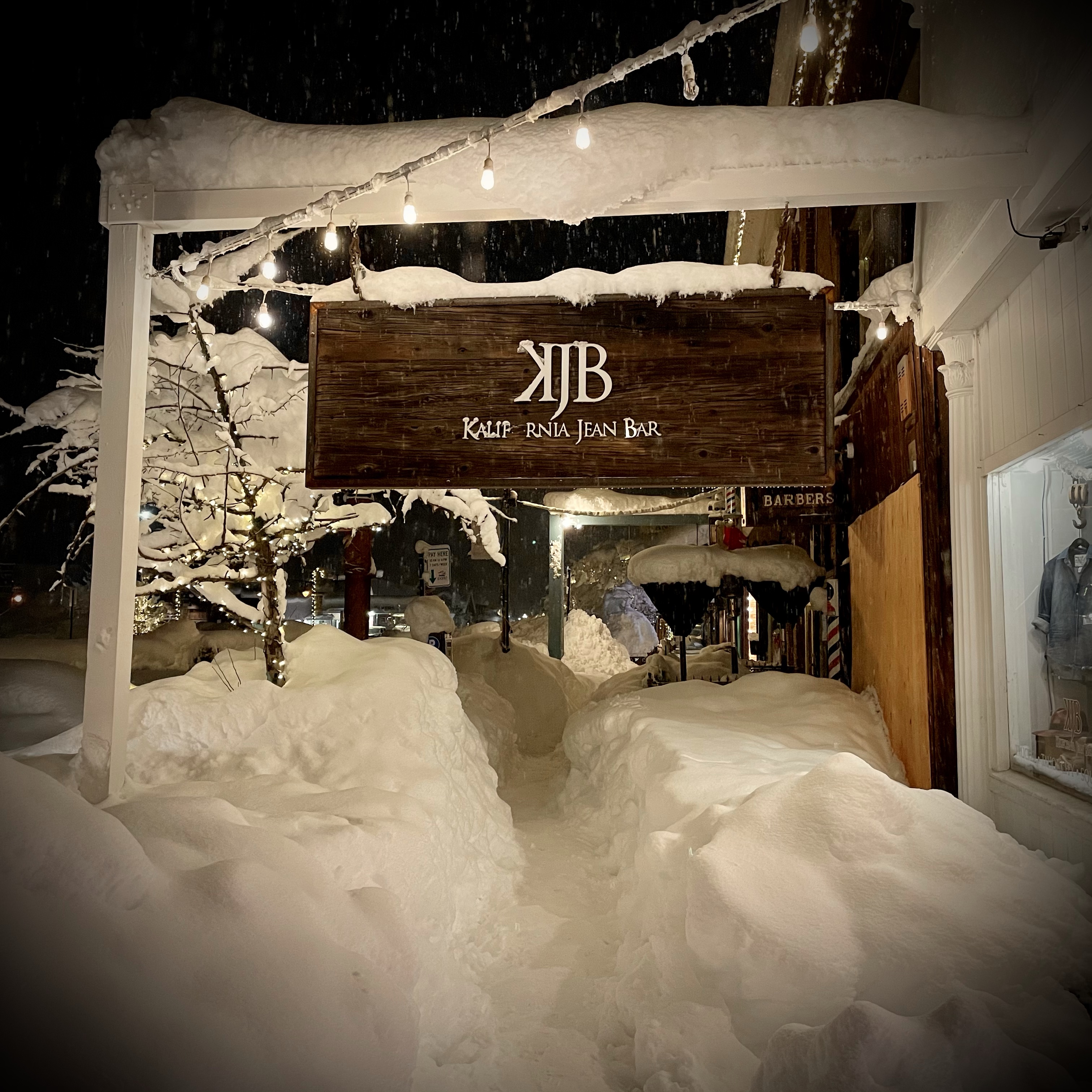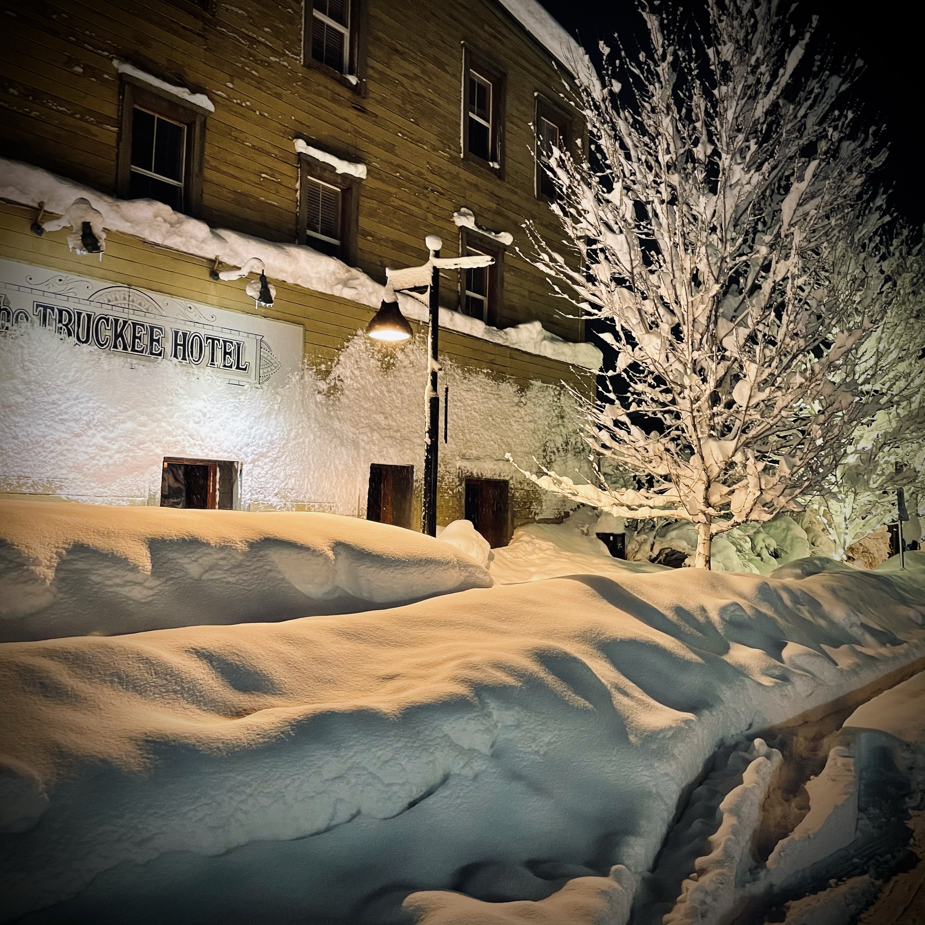 a very snowy Truckee Hotel and Moody’s sidewalk